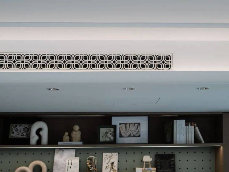 项目的下沉庭院,取意于古汉阳十景,如诗如画,庭院池底是凤凰图腾,楚文化展示长廊、揽月雕塑,延续云梦古泽、高山流水的意境,打造一番山水小天地;样板间的中央空调出风口与室内门面,均采用定制的蛟龙纹。