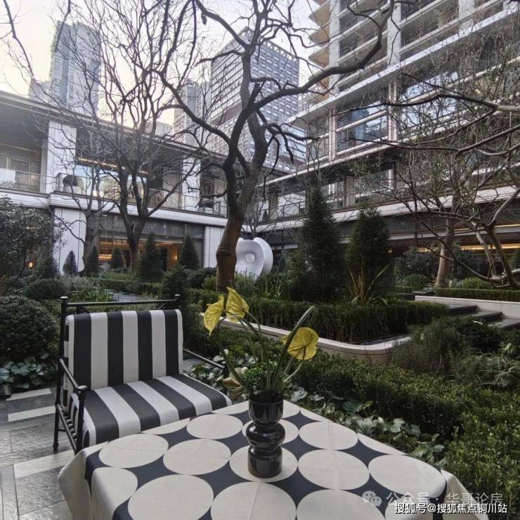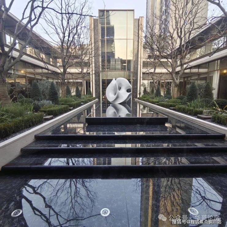 中庭的园林规模不算大,但设计较为考究,借鉴了西班牙故宫“阿尔罕布拉宫”的设计手法,营造了列阵跳泉、幻影水台、艺术雕塑,全冠移植8株名贵的乌桕个油橄榄,这种配置,一般只有较高端的项目才会采用。