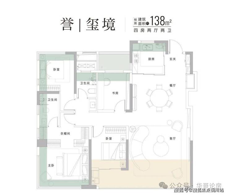 建筑面积约138㎡四房,南向面宽约12.4m,约5.2m大宽厅,主卧套房开间约4.2m,带270º观景飘窗。