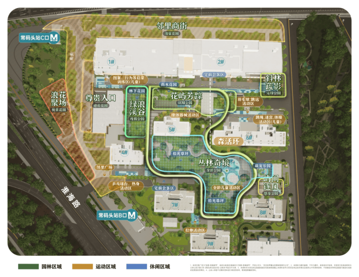 作为最早将“花园城市”理念带入中国的企业,凯德发展为淮海壹号打造了“浪花公园里,杉林岛屿间”的绿林森系微度假社区,内外双园设计将“森系理念”贯穿社区营造。在这片森系空间中,有组织但手法自由地布局“一环五园”绿色规划,以绿浪溪谷打造诗意的归家之路,通过约400米的有氧健康跑道“森活环”,串联丛林奇境、花屿芳踪、屿间逐风、斜林疏影等四大主题场景,让居者漫步园中就能体验移步换景的奇妙和松弛生活的真谛。