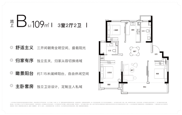 建面约109平三房户型,以主流的LDKB设计为主,客餐厨纵向一体化,并且以客餐厨作为主要生活区和次要生活区的中轴进行区分。