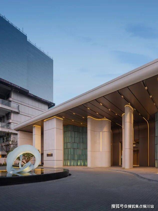 打造约10米高、约70米宽的奢阔门庭,两侧高门仪柱巍然矗立,紫铜锤纹标识搭配天青色瓷板,承传统阀阅礼制,藏住家族尊崇。中心“生生不息”主题水景雕塑(灵感源于莫比乌斯环),恭迎业主荣耀归家,入口精选精品石榴树种,寓意金玉满堂。