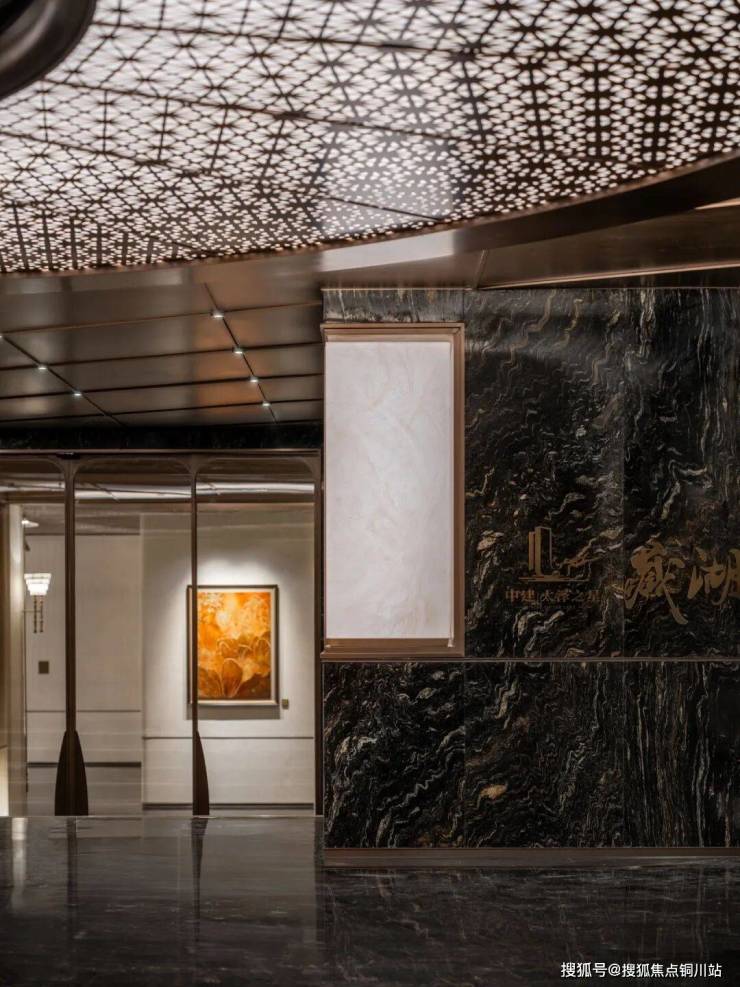 天青色汝窑瓷板饰面取太湖烟雨之色,非遗金属抬凿錾刻装饰复刻太湖渔文化,“瑞鱼旋舞”吊灯源自苏州非遗鱼灯,苏扇元素石材拼花铺陈地面,每一处细节都在诉说太湖故事。皇家级车马厅墙面采用黑金纹大理石拼接,洽谈区金漆弧顶造型源自苏州石拱桥,华贵中见文雅。