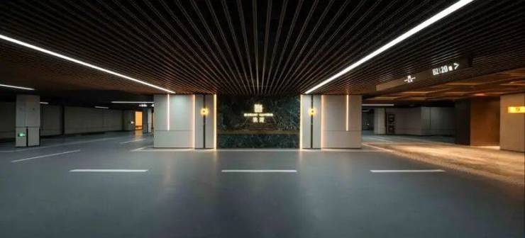 重点打造的酒店式落客区,采用天地墙一体化设计,铺装天然石材,顶部为金属藻井格栅,辅以定制标识系统,塑造出更具仪式感的到达场景。细节处如云石把手、车位柱金属护角、一体式挡车器等,均体现出对美学与功能融合的追求。