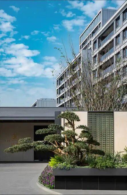 西侧宽约百米的的酒店式门庭,百万级的迎客松,以苍翠温润的力量感,续写着时间的故事。迪奥米黄景墙的细腻肌理,以东方隔景智慧,轻柔地划分内外。