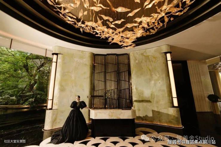 社区主入口横向展开面长达百米、高6米,参考酒店式入户设计,布置环岛落客区奢侈空间尺度。范思哲黑与安哥拉黑石材低调华贵,顶面千片鳞片造型似江浪灵动,百达翡翠原石与黄铜镶嵌而成“王冠之瞳”,整体空间奢华与优雅并存。
