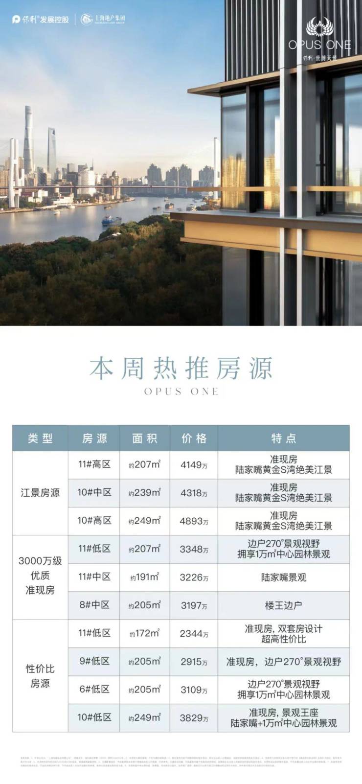 保利世博天悦,离江最近的一幢双面瞰江楼栋11#,少量建面191㎡-207㎡三四居室楼王,总价段集中在2800-4500万,直接认购!
