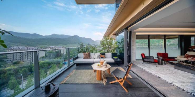但真正让人心动的,是那个约35㎡的空中花园。得益于四代宅奇偶错层的设计,这里拥有约6.2米的惊人挑高,视野非常开阔。站在这里,山风拂面,鸟鸣入耳,恍惚间竟分不清身在室内还是山间。