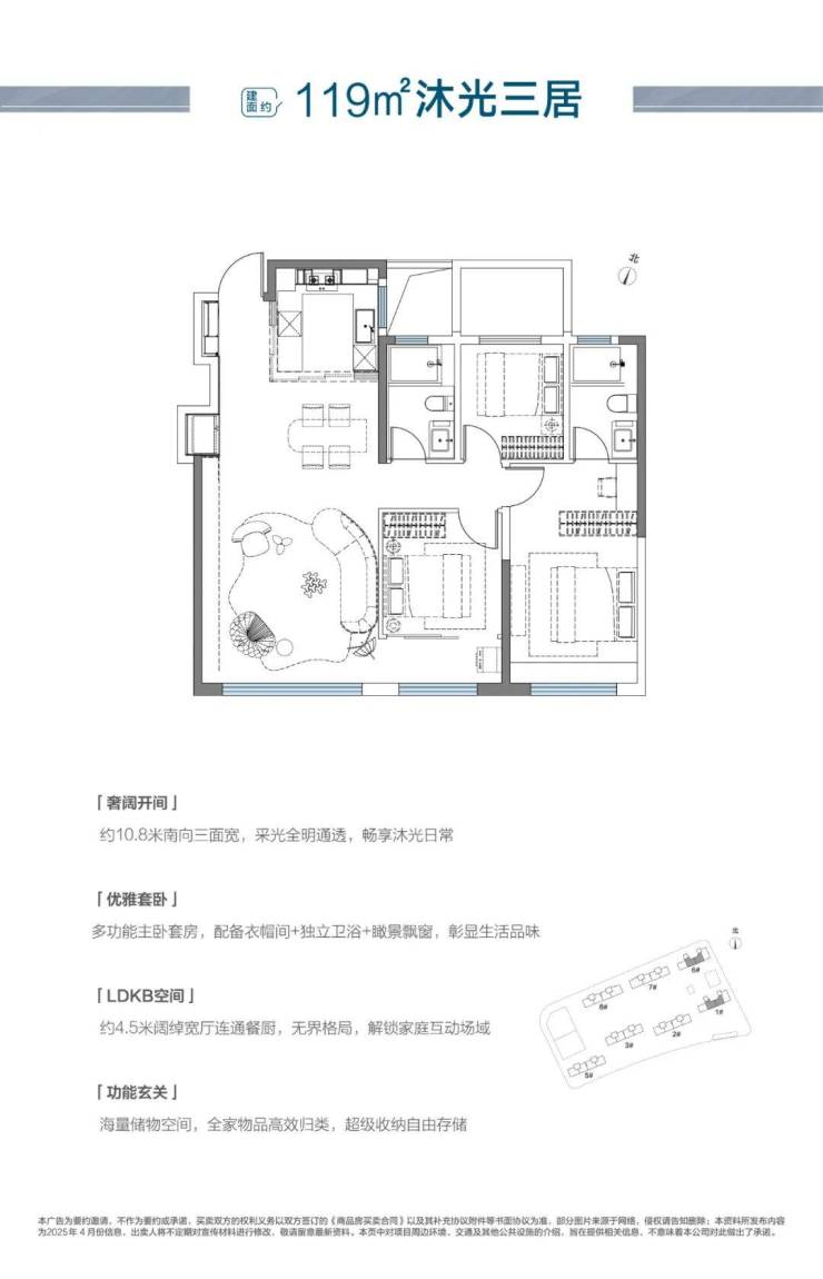 其中,建面约119㎡沐光三居,创新S型收纳墙,约10.8m南向三面宽+约7.5m联通式阳台,最大化室内日常采光,以约4.5m宽厅为核心,打造LDKB一体化布局,尽享家庭的欢聚日常。