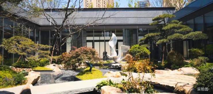 石谷流云的下沉庭院,纯铜锻造的玉兰花主题雕塑映入眼帘,成为整个庭院的视觉中心。