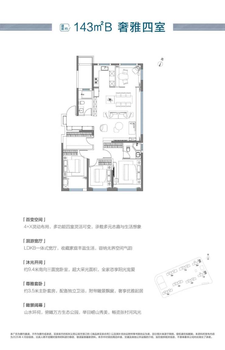 建面约143㎡阔境四房空间,东边户实际得房率高达90%以上,成为同面积产品置业性价比首选,三阳台+双飘窗超级赠送,4+x的灵动设计呈现崂山改善钟情之选。