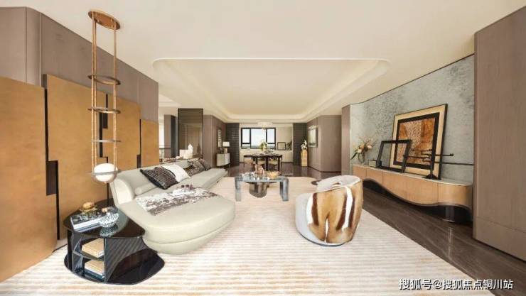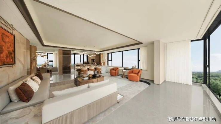 以下面这个180平方米户型为例。为了打开更舒适的空间尺度,美的东望府采用了“无梁体设计”,从客餐厨直到阳台区域都没有任何梁与柱网阻隔,用敞亮的动区一体化格局,凸显大平层的气度。