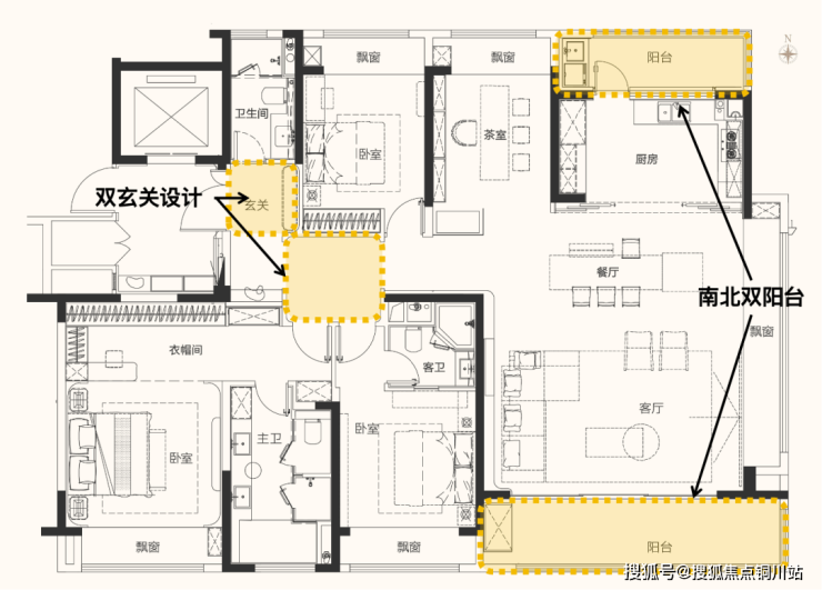 再来看看这个210平方米户型,首先是配置了南北双阳台,通透感拉满;其次,端厅结构实现了270°环幕观景,结合高窗墙比立面,让景观优势得到了进一步放大。