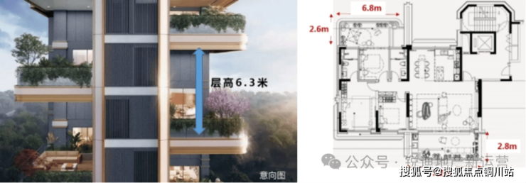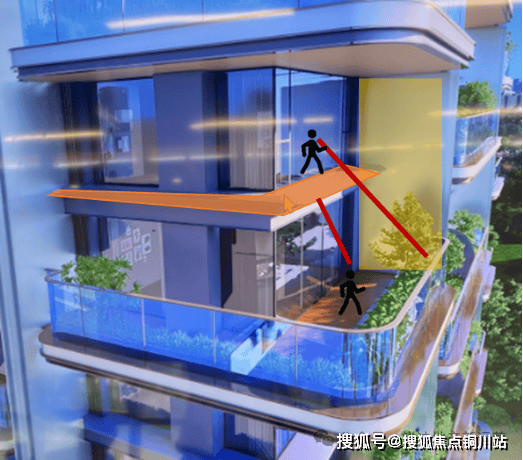 上下两层之间增加一块飘板遮挡视线,上层往下看,视线基本落在露台之外,同时下层往上视线也多落于挡板上。左右户型之间隔板设计也更好阻隔了可能出现的视线干扰,全方位守护私密性。