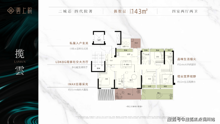 建面约143㎡“揽云”户型,以一梯一户的私密配置、约15.4米南向四开间采光以及更为阔绰的庭院面积,满足多代家庭对舒适性与功能性的双重需求,主卧套房设计更融合星级酒店的度假体验,重塑改善生活的标准。