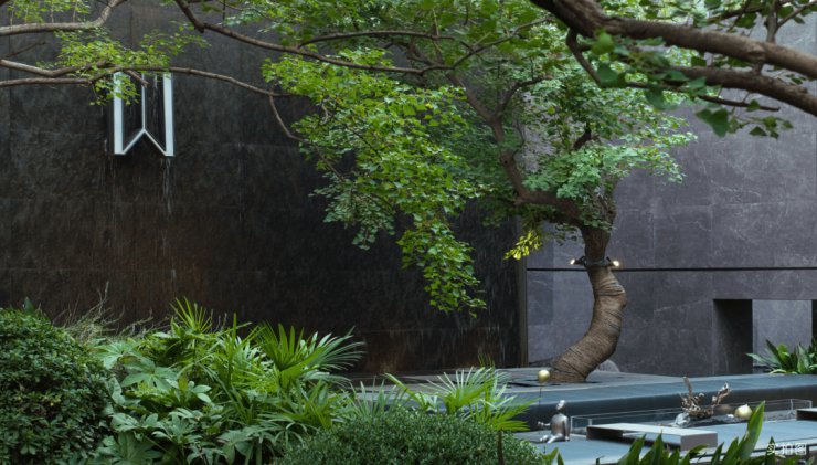 在植物栽种时,阅山府考虑不同角度呈现不同景色,甚至用吊车将树木悬挂在空中进行 360 °的旋转,来找到树木枝叶伸展出的最佳姿态。