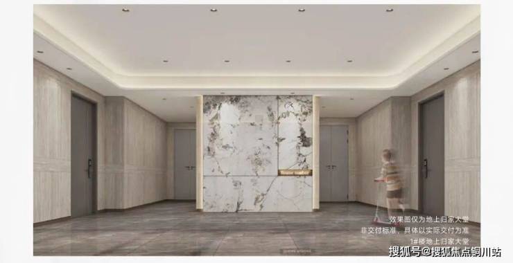 注重归家的仪式感,更重视心灵的归藏,奢装地上入户大堂,公区墙面地面均采用仿石材墙砖,大堂主背景采用仿石材岩板,搭配古铜色不锈钢踢脚线收口线,营造尊崇的入户体验,彰显奢宅生活主张。