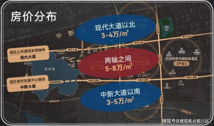 两轴之间的房产价格表现极为坚挺,高品质房源价格稳定维持在5-8万/㎡的区间,比如上华琚、沁苏禧、缦月、唐宁府等,二手房价格显著高于周边区域。相比之下,现代大道以北房价大致在3-4万/㎡,中新大道以南约为3-5万/㎡,呈现出明显的中间高、南北低的价格态势,从价值维度考量,两轴之间无疑占据首位。