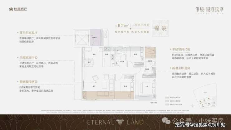建面约105平户型就能做到约5米横厅,大三房两卫的格局