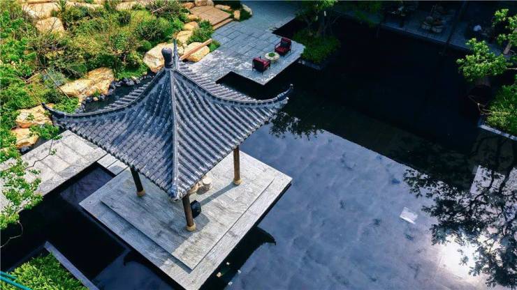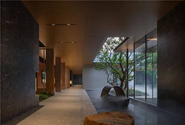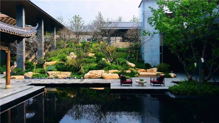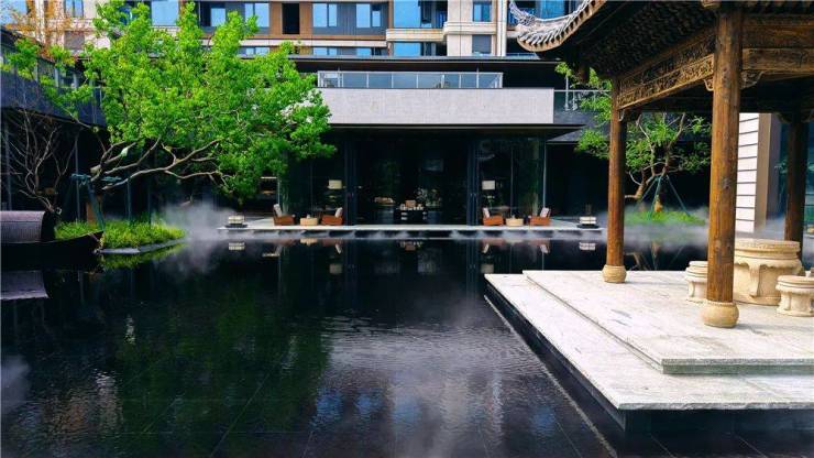 整个水景园林约800平米,除了打造有中式园林尊崇的归家体验外,还在植物选配上格外讲究。