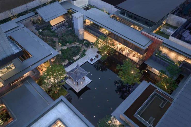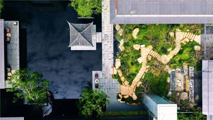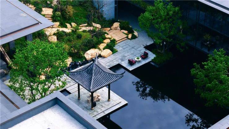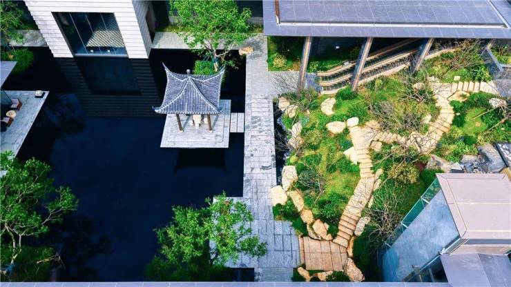 这种双首层的园林设计让景观更加错落有致,同时,也形成了一条具备风雨连廊作用的归家动线,让业主像是穿梭于山水画之中。
