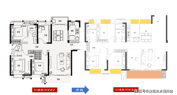 相较于前期地块户型,K1地块去掉了部分承重墙,实现了户内空间可变,留给改善客户根据自己家庭成员生命周期变化而改动的自由。另外开间也变得更大,得房率明显上升。