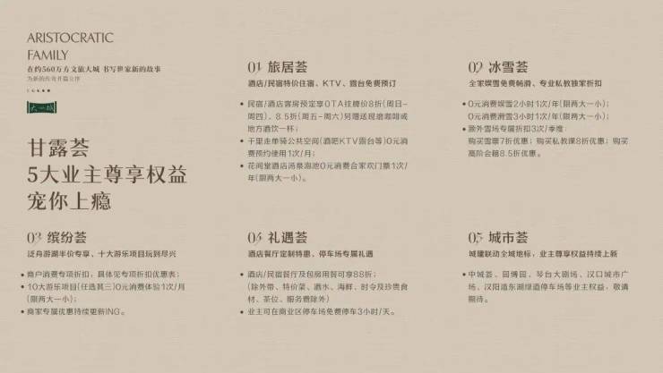 【甘露荟】为业主提供5大尊享权益,从各维度满足吃喝玩乐购的旅居荟、冰雪荟、缤纷荟、礼遇荟、城市芸,营造更有温度的理想生活新方式。