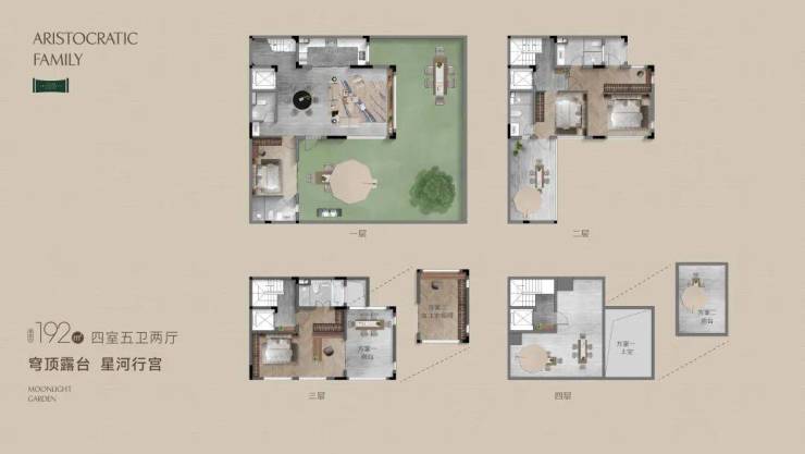 第四代垂直院落生态。武汉甘露山·朗园革新传统院居,让业主随时可以拥抱自然。首层户均享有约150㎡私家庭院,二层叠景露台面积约53㎡,三层星空露台面积约122㎡,形成“归来有院+空中有园+星空为顶”的三维生态链,打造层层叠翠的理想院境。