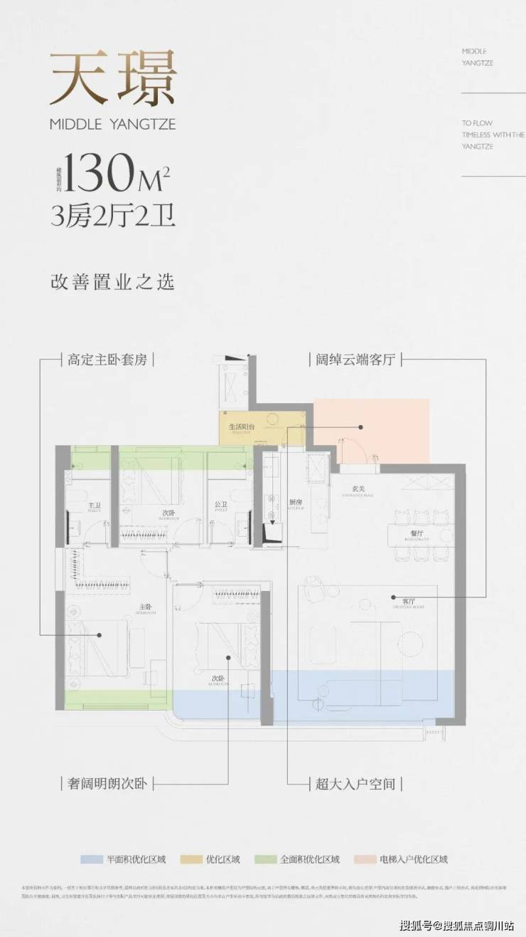 该户型为3号楼中间户,南北通透,三开间朝南,该户型带独立电梯前室,南向客厅和次卧,均有阳台半面积优化空间,两个次卧和卫生间均有飘窗全面积优化,此外,厨房外还有个区域或可优化成生活阳台。
