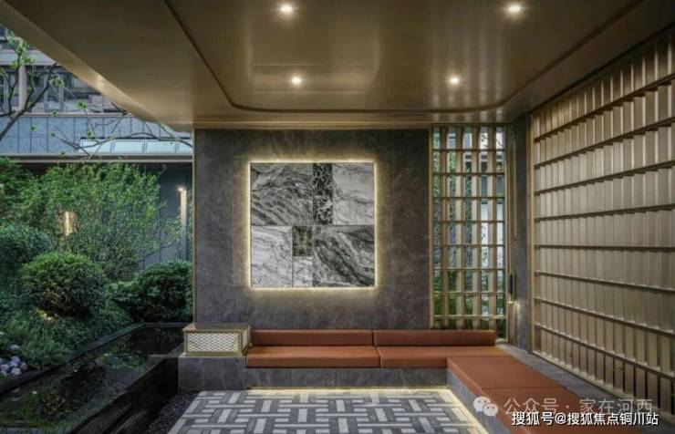 奢华典雅的单元入户大堂,金属铝板,奢石景墙,红枫掩映,归家仪式感拉满。