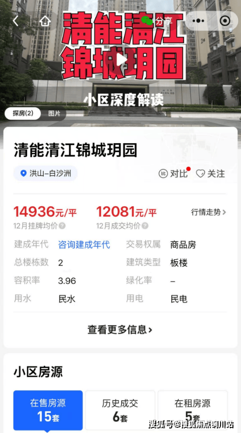 稍远一点同为清能开发、楼龄较新的清能清江锦城玥园,挂牌均价约1.5元/㎡,但12月成交均价约1.2万。