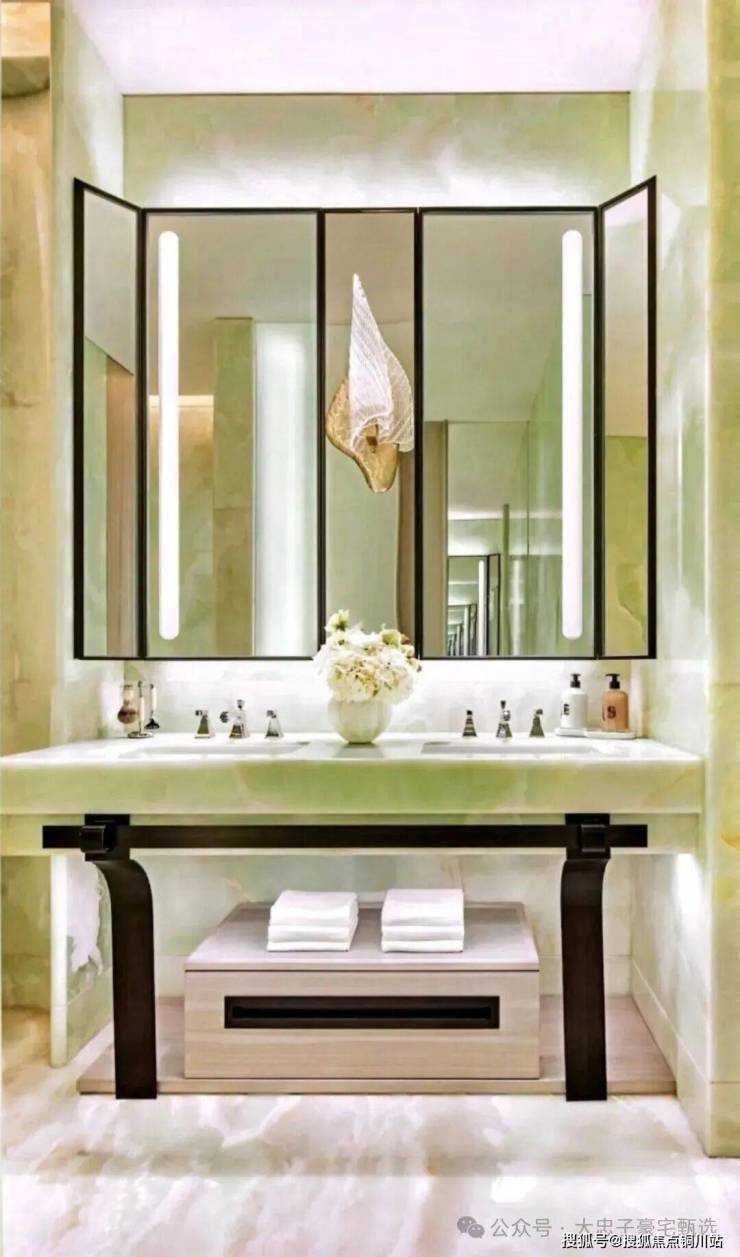 顶层下午茶区以淡绿为底,壁炉暖光漫过手绘地毯的肌理,将社交场域沉淀为冥想容器;主人房墙面缟玛瑙(Onyx)的天然流痕,也与一层屏风暗纹形成时空对位,光影在矿物晶体中生长出私密的诗。