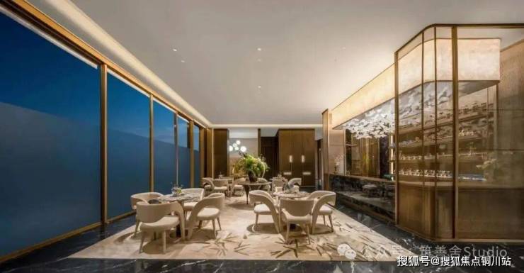 [晓月序厅]生活美学馆,占地约500平方米。其入口处以“明月松间照、清泉石上流”的诗意境界,巧妙地勾勒出城市与社区的界限,将喧嚣隔绝门外,引领您步入自然之静谧与休闲时光。馆内,独具匠心的双月形金属格栅,展现出绿城精湛工艺;精选挪威进口的蓝珍珠石材,以其独特的自然纹理,成为空间装饰的主旋律,营造出一种优雅而尊贵的氛围。