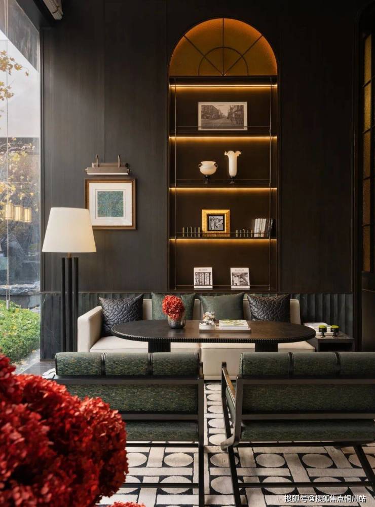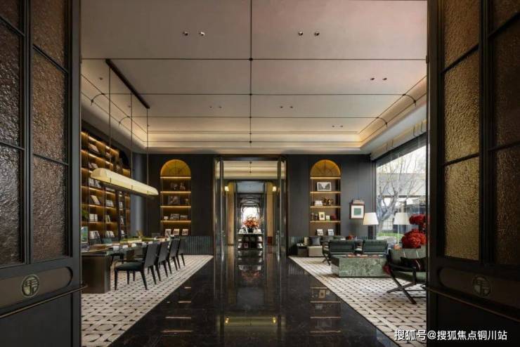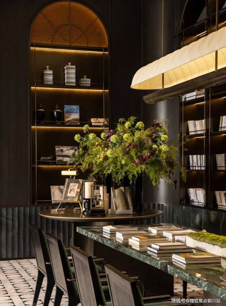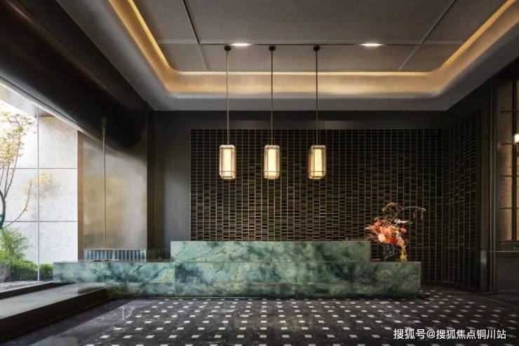 接待大堂设计手法延续海派风格的文化特点,保留了复古与摩登的时尚感,其中提取出晋派建筑标志性合院的回型纹样、瓦片、琉璃、黑金配色和天珺绿奢石五大元素,古典西方与晋派东方的结合,赋予了空间以文化感,实现了中西方文化的交流碰撞。