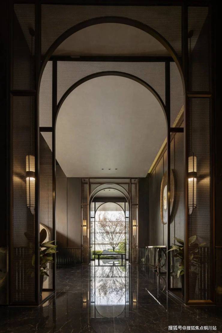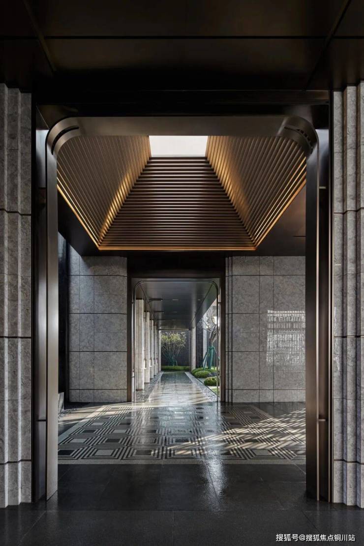正门方向, 1300余枚定制琉璃分列两侧,晶莹透亮;窗外溪涧花园与林樾花园的绿意春色渗透进入门廊;门廊的尽头则是镌刻“珺”字的接待厅水纹玻璃门,恭迎宾主。