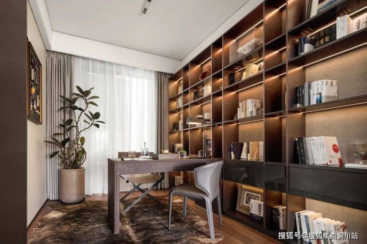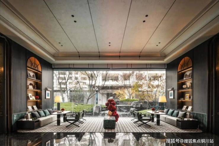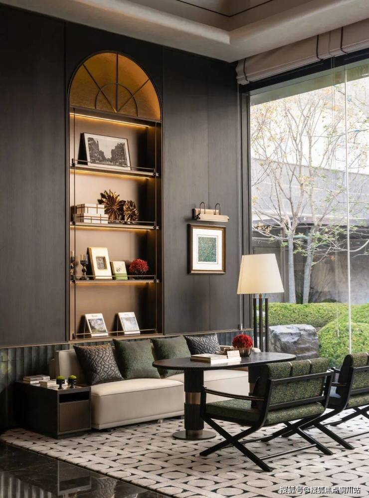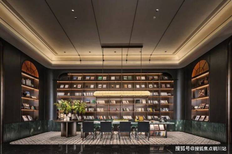 落座于洽谈区,落地窗将户外景致引入室内,悄然抹去室内与自然的边界。琉璃的屏风及满墙的书柜,打破空间的沉闷,增加了空间的情绪及与张力;同时这里也是社区文化交流的场所,未来业主可以在这里参加读书会、讲座等活动,与志同道合的人分享知识和生活。