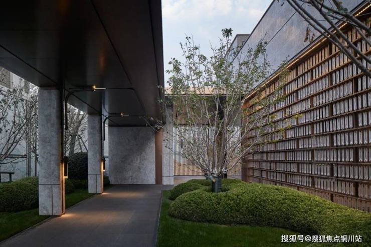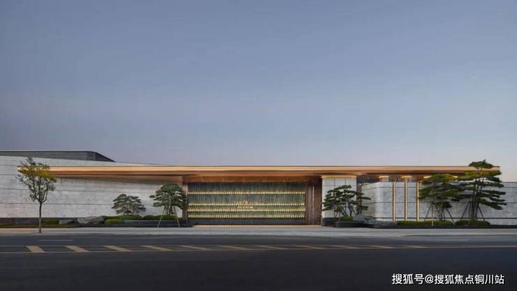 临路设置侧入式的门楼作为人行主入口,采用非对称布局,拉长前场景观动线,营造游园入境、自然隐奢的归家体验;入口门楼高宽比例控制在1:10,强化横向超尺度比例。