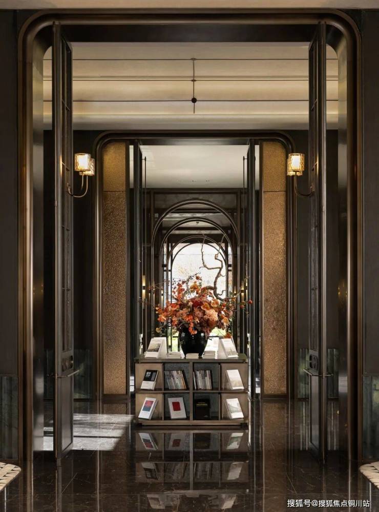 大门右转入园,步入鎏金漫廊,水纹玻璃挂灯身畔随行,尽头的石龛中是以《绽放》为题的雕塑,雕刻纹的穹顶纹理与金属编织的质感立面衬托着温润生动的花瓣之形,与自然盛景相映成趣。
