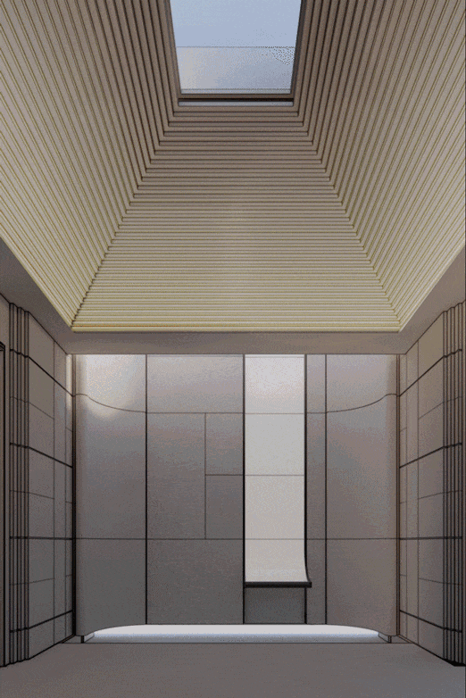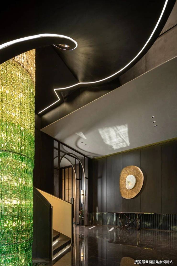 门堂前的过厅,空间方正,天光倾泻,斯卡帕风格的30层跌级在灯光的映衬中向上收束;范思哲黑与普拉达绿奢石交织成的景墙映衬着潺潺水幕,展现出静影沉璧的雅致画卷。
