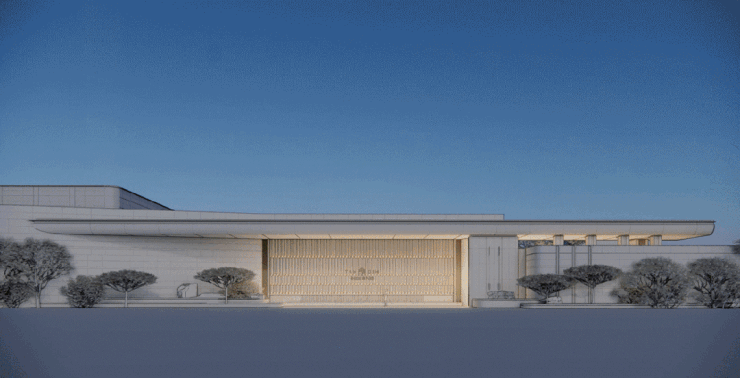 主入口墙面选用600+㎡意大利蓝白石,以4类尺度与差异化搭接工法组合,构建出有序列感的分缝层级系统,将大院高墙的意向不仅仅停留在单有尺度的恢弘,而是层级多样,适配不同距离尺度的视点,尽显精致华贵。