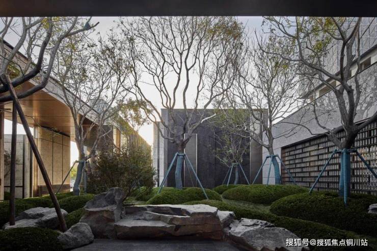 漫廊边的林樾花园以古朴厚重的黑山石为底;几株寓意吉祥的栾树浮隐在园中,待到秋日,高悬的果实更是团簇烂漫,正如其别号灯笼树、摇钱树。