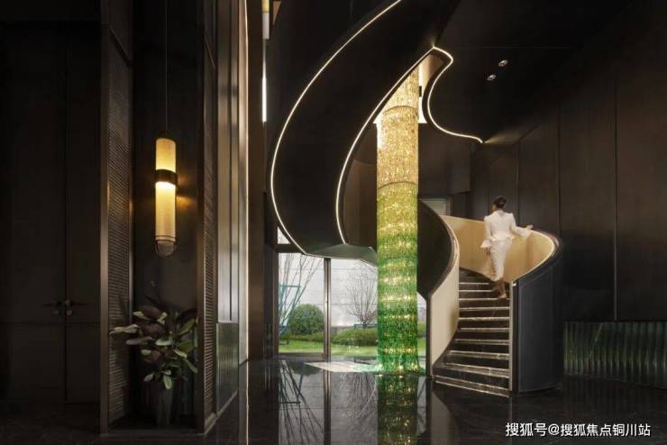 沿着全皮质包裹的旋转楼梯石阶而上,感受着无与伦比的舒适与尊贵;中间9米高的翡翠吊灯,整体由金色渐变为绿色营造层层递进的视效,象征着岁月迭代新生,同时以其独特的质感和光泽,照亮了楼梯的每一个转角,为归家增添了一份奢华与优雅。它不仅是空间的点缀,更是生活品质。