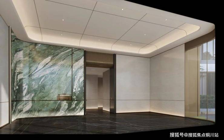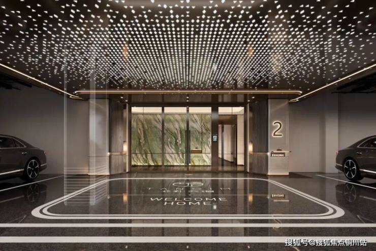 礼仪化的地下归家大堂,体现高端品质感。顶面借鉴劳斯莱斯星空顶的设计理念,高阶色系铝板镶嵌定制星光图案,再造一方灿烂星空,典雅、梦幻、奢华。端景墙面维多利亚绿色奢石每块都承载着品质的承诺,引领着归家的温馨。