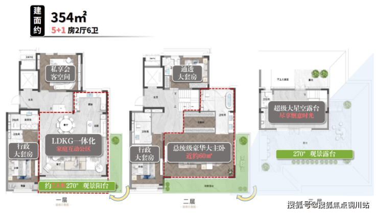 建面约354㎡上叠户型与建面约306㎡的下叠格局一致,三楼带有plus版星空露台。尽情发挥灵感打造属于自己的一方天地!