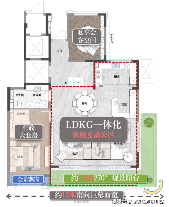 一层打造约13m巨幅面宽,超级LDKG一体化无界宽厅搭配跑道式阳台,气场全开。