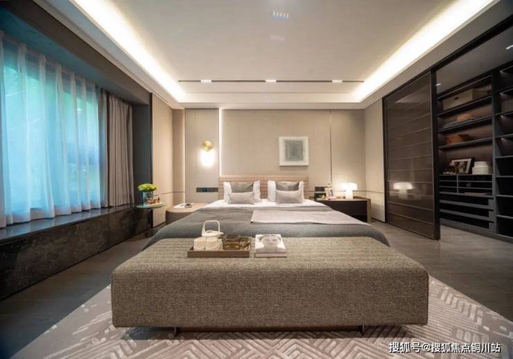 主卧带来的视觉冲击,就像超豪华酒店一般,超大空间无需赘述,依旧是无主灯设计,搭配格调素雅的色彩布局,飘窗也是天然大理石铺满。