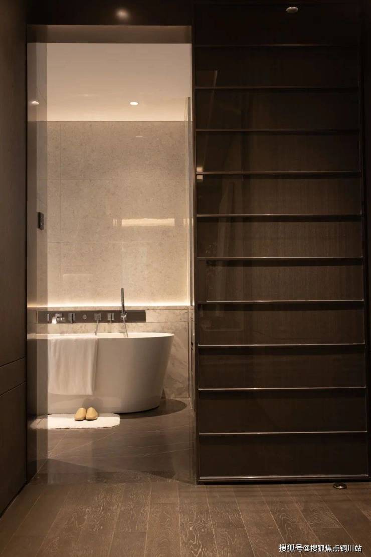 套间里还有五星级酒店的浴缸配置,全部石材铺满,暖色灯带+墙排设计,生活的仪式感和品质感,一下子就被填满。
