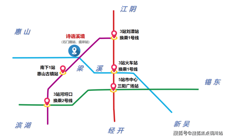 项目近临3号线——石门路站,和与4号线双地铁交汇处——盛岸站,南下1站惠山古镇站,北上3站刘潭站,换乘地铁1号线,3站直达无锡火车站,经火车站换乘,再过2站直达市中心恒隆广场、苏宁广场、八佰伴和三阳广场商圈。