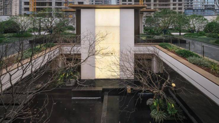 漫步其间,还能看到一片层层跌水的景墙,特型铁冬青斜飘于水面,让归家之旅就像是在花园中漫游。