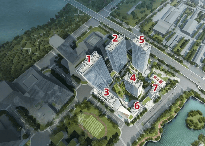 楼栋布局:项目共规划 7 栋住宅以及 1 所 3F 幼儿园,整体以塔楼高度递进的方式设计,保障视野最大化。